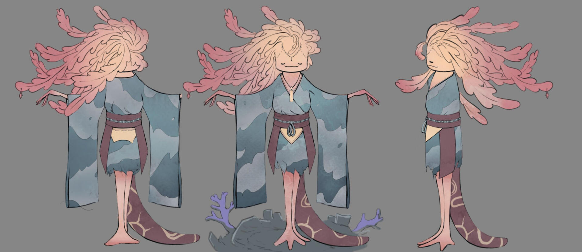 First I had to come up with a concept. I only had a week to finish pre-production. I decided on a fantasy themed dancer axolotl with shrine maiden themes,
